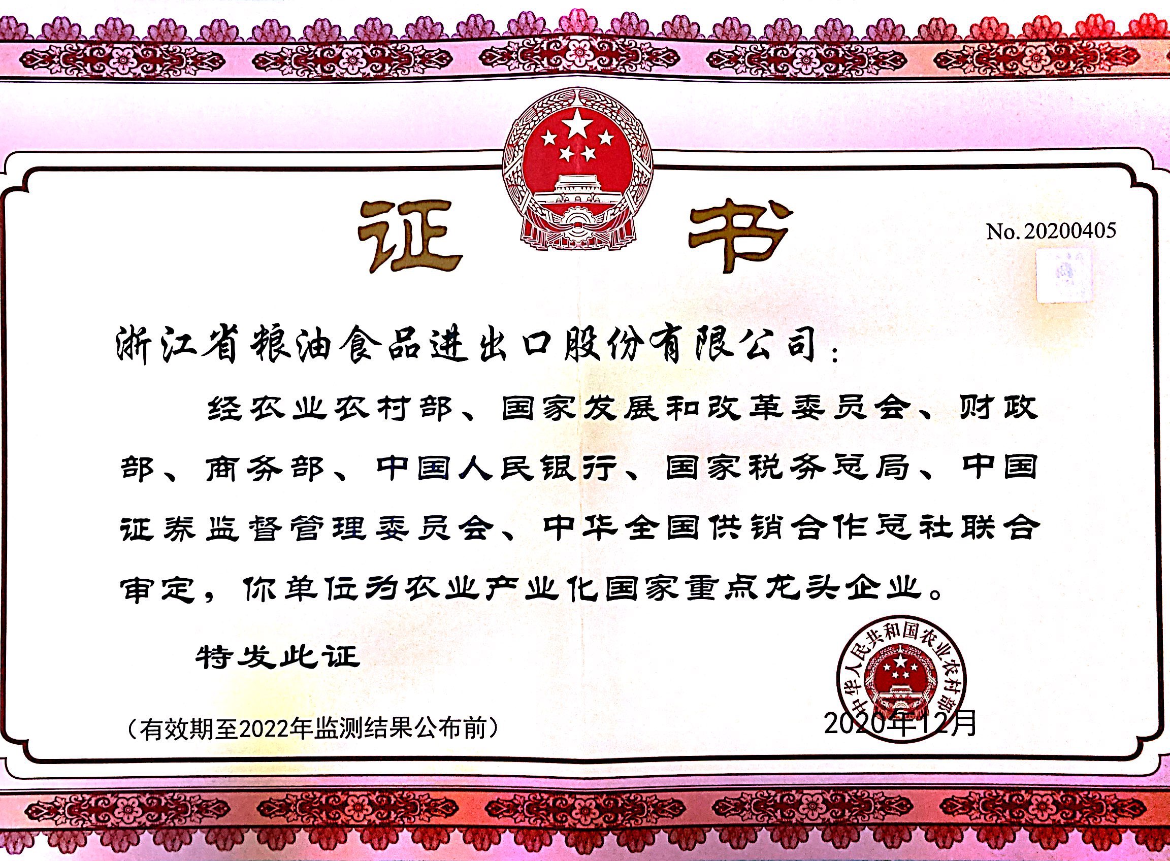公司與寧波天韻公司通過第九次農業(yè)產業(yè)化國家重點龍頭企業(yè)監(jiān)測復評